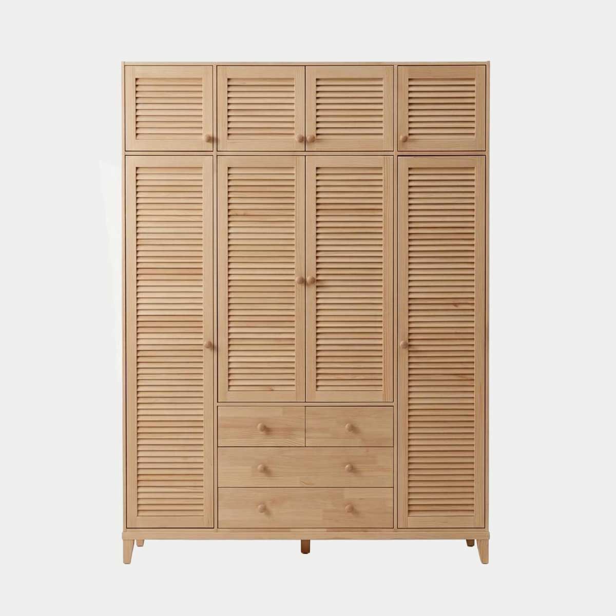 Geleneksel panjur kapak estetiğini modern teknolojiyle birleştiren bu dolap, yüksek tavanlı odalar için geniş bir depolama alanı sunar. Ahşabın nefes alan yapısı sayesinde kıyafetleriniz her zaman taze kalır.